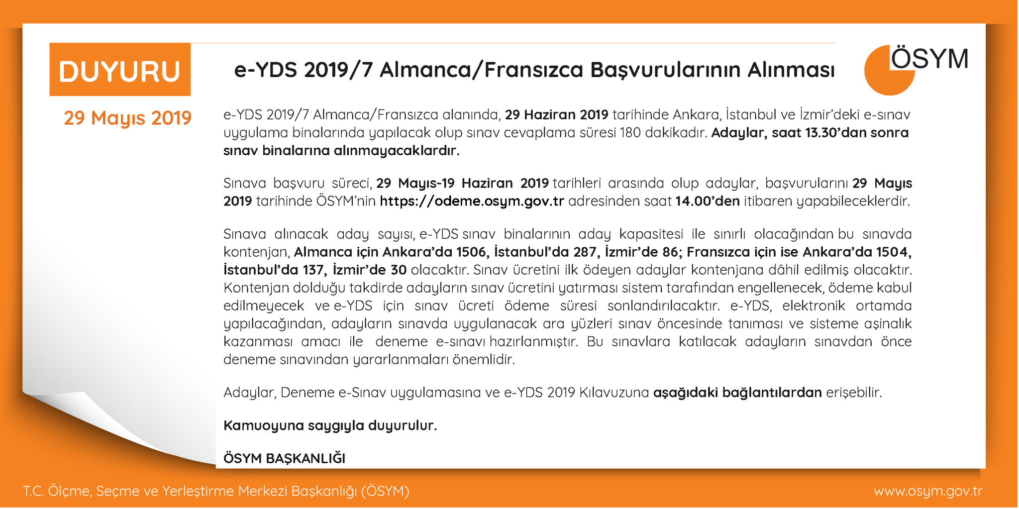 E yds ösym tarafından belirlenen sınav merkezlerinde gerçekleştiriliyor. Bu durum e yds sınav binalarının aday kapasitesi ile sınırlandırılmakta olup kontenjan sayıları şu şekilde belirtilmiştir. 19 aralık 2020 tarihinde ankara i̇stanbul ve i̇zmir deki e sınav uygulama binalarında yapılması planlanan e yds 2020 13 i̇ngilizce sınavı hakkında son dakika açıklaması yapıldı. ösym 30 eylül itibariyle sınav için başvuruları.